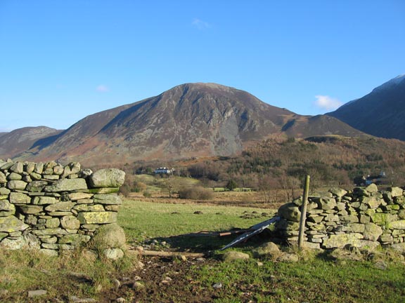 The descent from Low Fell must rate as one of the steepest public footpaths I know. Looking down to the same barn as before, and a second shot with Ann almost silhouetted against Melbreak.