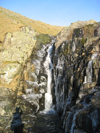 On the way back down we crossed to the right hand side of the stream which had been in the sun during the day. The ground was steeper and harder going without the path, but it was dry and soft, and the grass gave a safer way down while we by-passed the iced sections. Safely down to valley level and a picture of Helm Crag with more than a hint of red in the sky. In the foreground are the rocks we passed on the way up from the car (see top picture). Helm Crag at the end of the walk. The "Howitzer" summit rock on the summit and the lion's head part of the "Lion and the Lamb" to the left.