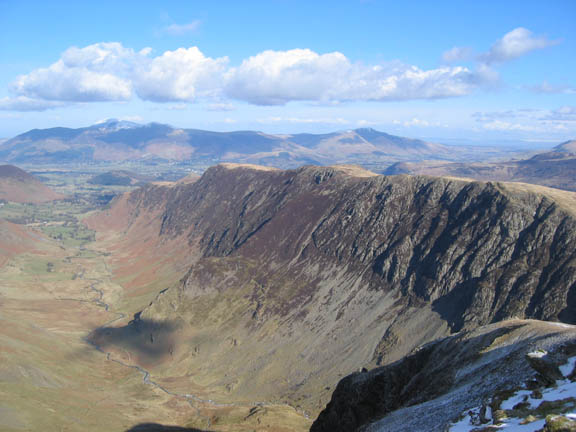 Esk Pike, Great End, the Scafells and Great Gable dominate the background. After leaving the flatter top of Hindscarth we headed back to continue the ridge walk to Buttermere. A deviation to the right took us from the main path down the slightly steeper gradient direct to the hause between Hindscarth and Robinson. Looking back at Hindscarth and Dale Head from the ascent of Robinson. A closer view of Honister Hause and the Slate Mines with a large sprinkling of snow on Glaramara behind. Robinson Summit cairn with the north western fells behind. Grasmoor and Eel Crag with the snow, Wandope in front, and Grisedale Pike behind Ann. Another short walk north along the summit of Robinson this time. A flatter top but with similar views, this time over the top of Causey Pike to Skiddaw, and over Derwent Water to Blencathra. A frozen summit tarn on Robinson. Harry sensibly avoiding the ice, or perhaps wondering why he couldn't find the water for a swim. A close up of that mountainous backdrop further enhanced by the slowly changing cloud formations above. A virtually cloudless sky here as we left the distinctive twin peaked summit of Robinson. The view ahead - Rannerdale Knotts, Crummock and Loweswater. as we descended to High Snockrigg (the dark foreground beyond the immediate ridge). A wider shot of Robinson over Buttermere Moss from Snockrigg, with little hint of the snow we left behind Normally crossing the Moss would have been a wet walk, but the cold weather had frozen the ground sufficiently to make the going firm and virtually dry.