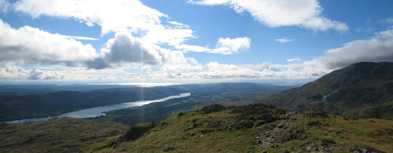 The route across culminated in an awkward little drop where the excavator had taken a chunk out of the hillside for the pipeline. A ten foot wet and muddy scramble later and we were safely past the temporary obstruction, much to the bemusement of the pipeline crew. Lets hope they re-instate the footpath safely. Coniston Copper Mines Youth Hostel, in white, nestles amongst the relics of the industrial valley. We however, take an early path up through the old quarries to the right and start our climb to Wetherlam. Gaining height now with good views of Coniston Old Man. By the time we had climbed sufficiently to get a view of Levers Water the cloud had cleared the summit and a fine day was in prospect. Looking out to sea from Lad Stones, high on the Wetherlam ridge. Click here or on the photo for a larger view Langdale Pikes from Wetherlam summit, and the visibility was superb. Click here or on the photo for a full panorama of today's view They don't get much better than this. ( I hope the photo does it credit.) Off around the back of Black Sails and across to Swirl How via the Prison Band. Regards to Andy here, a fellow walker we met along the way.
