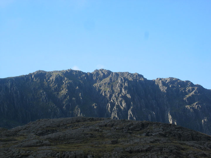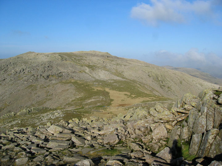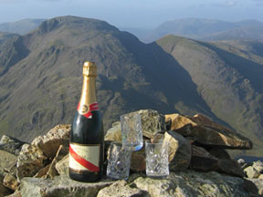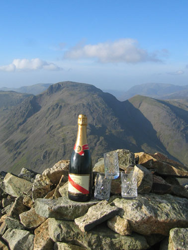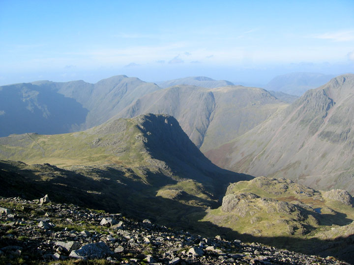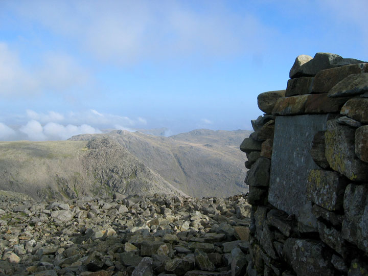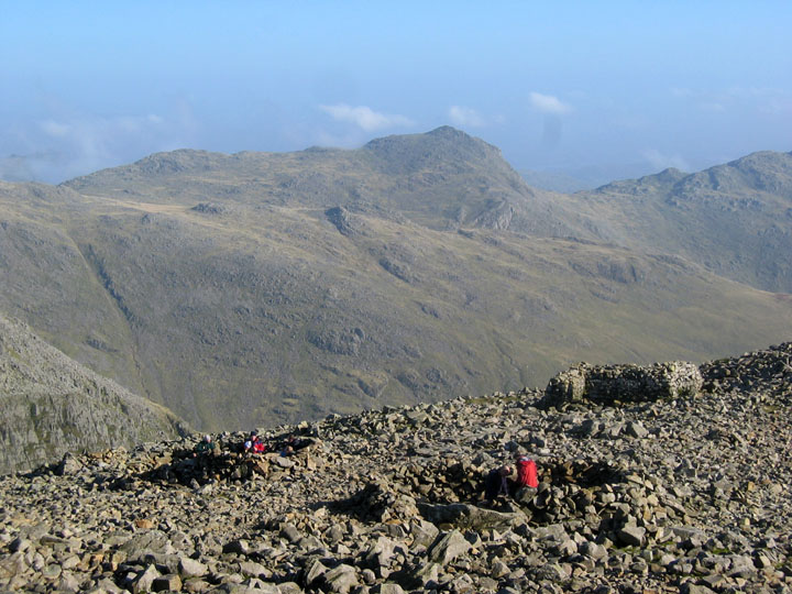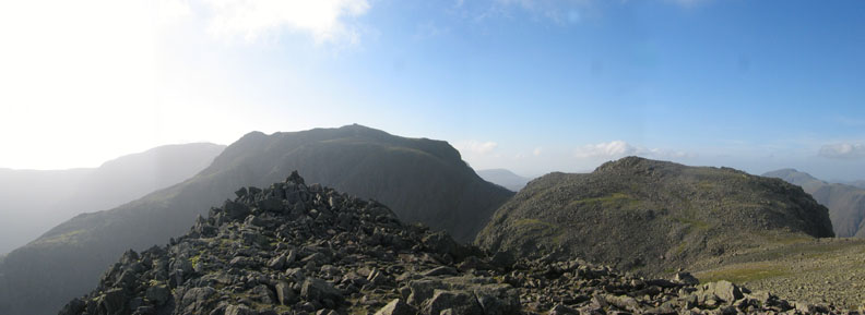 The summit plaque, looking east to the Langdale valley. It still seems to be holding onto a little cloud. Bowfell standing proud above the many summit shelters on Scafell Pike. Each has a small group of people sitting, and presumably enjoying their lunch, sheltered from the cool-ish breeze. The way ahead to Broad and Ill Crag, and Great End. Click here or on the photo for a larger annotated image Lingmell and a view across to Kirk Fell and Pillar, in the fine afternoon sunshine. Ill Crag summit and the view back, a reverse of the earlier picture. Our last goal in sight now as we scramble across the boulders, round the small pike, and walk over to Great End. Mission accomplished ~ and a reward awaits.