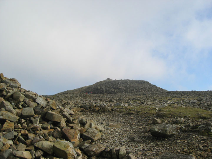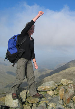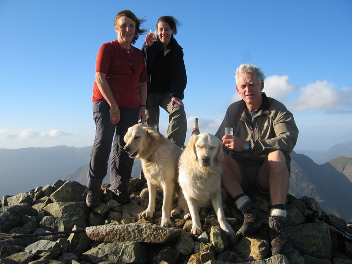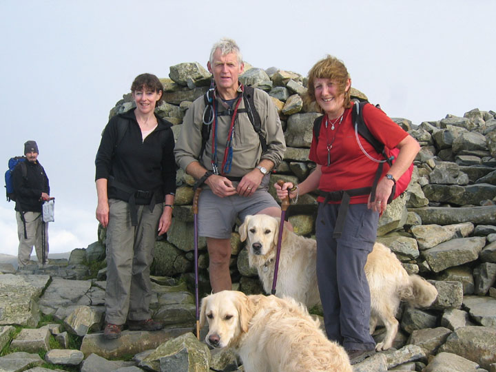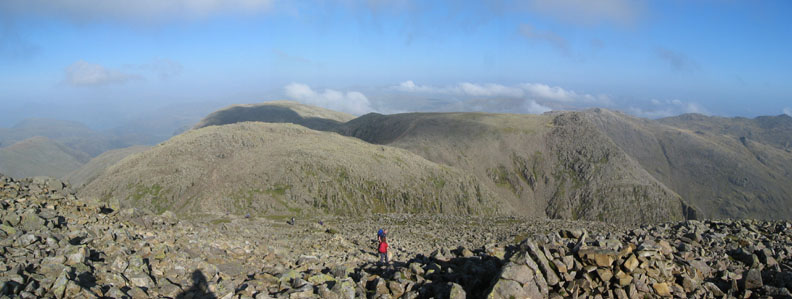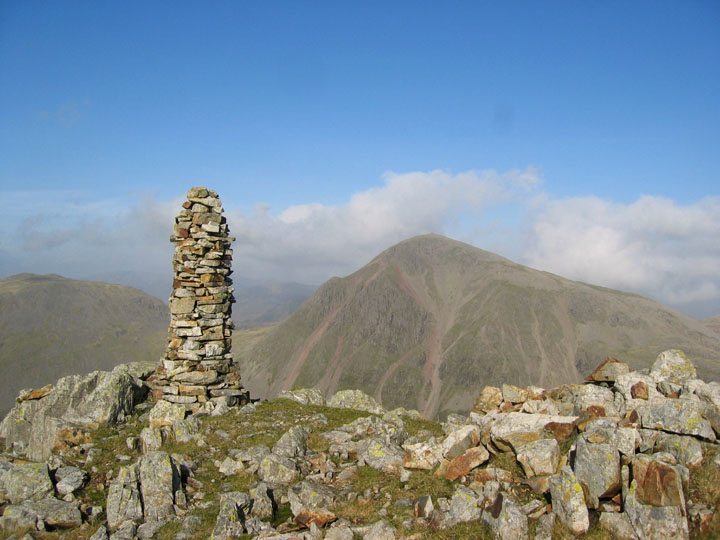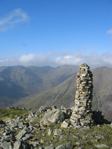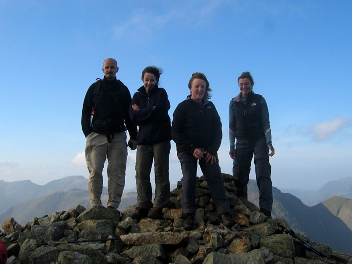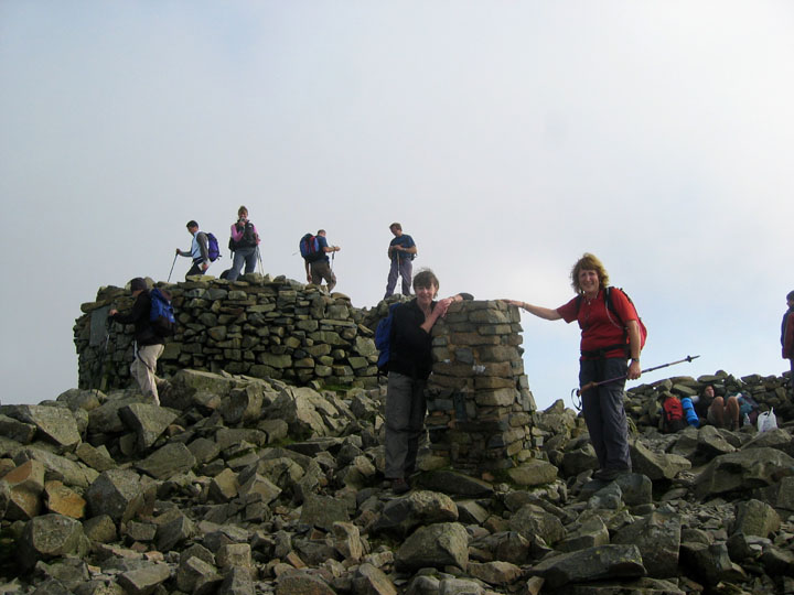 The pillared cairn again and the southern slopes of Great Gable. Leaving Lingmell, we join the popular "Lingmell Path" and make our way up towards Scafell Pike. First view of the summit, and the rocky fell top. There's no obvious path through the small boulders but a good line of cairns leads you clearly towards the summit. The two girls reach the Trig Point successfully, with plenty of energy left for the last major climb, up the large summit cairn behind. Group photo, courtesy of Liz, a fellow walker.
