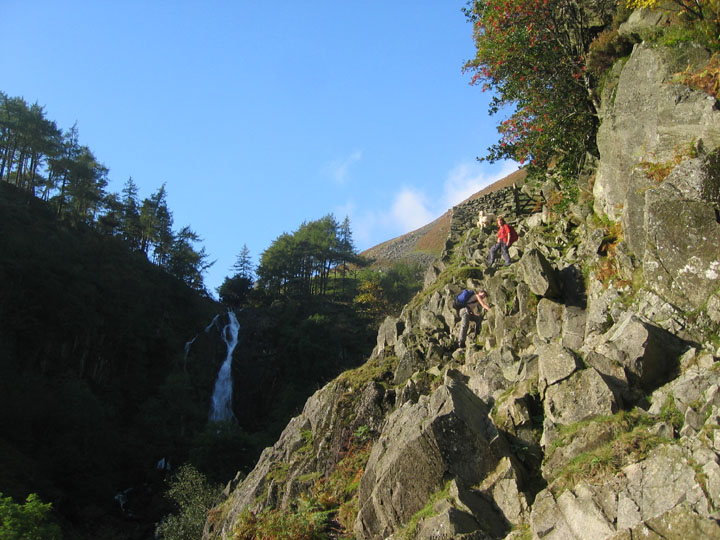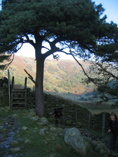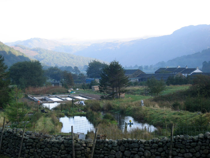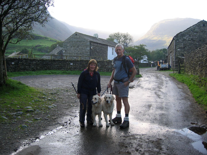 Walking the Wainwrights is considered by some as a task, by others as a pleasure, and by some outsiders as an obsession. For us they have been a delight. The first round took us twenty one years, the second round under five years, but we have had the advantage of living here within the fells for four out of the last five of them. They have taken us to all parts of the Lakes, to see all the valleys and the favourite fells from unusual directions. We have seen rain, hail and snow, been blown sideways, but where possible, walked in glorious sunshine too. This is the story of our walk to complete all the fells for a second time. We waited a short time for a nice day - always a good way to enjoy the fells. This was our weather prospect as we drive up Buttermere Valley. Sunshine, fluffy white clouds, but the high fells still have a covering of morning mist. Ann and myself at the start point, Seathwaite Farm in the Borrowdale Valley. Photo by Jill, who has driven over to join us for the walk. Rather than Stockley Bridge, we cross over and walk the other side of the river. The path is a little rougher here, making the first part of our walk a little slow. Still it is new route for us, and there is the prospect of a close view of Taylorgill Force ahead as we climb slowly towards Styhead Tarn. If you ever wondered where the local hotels get their fresh Borrowdale Trout from . . . now you know . . . Seathwaite Trout Farm