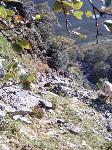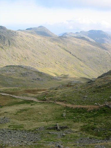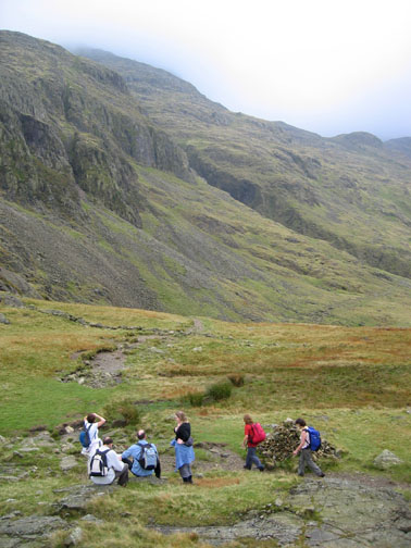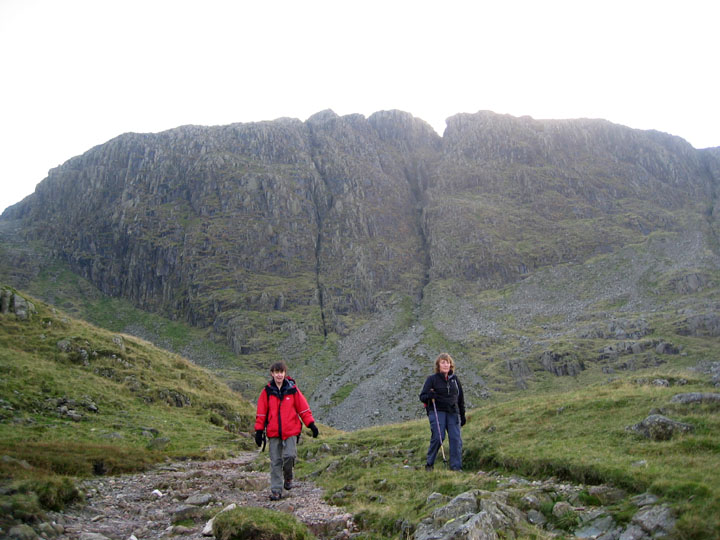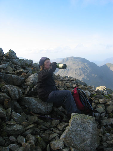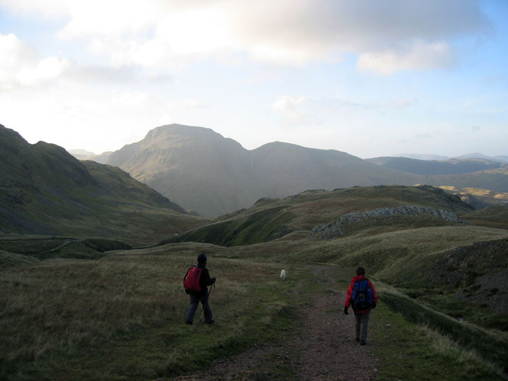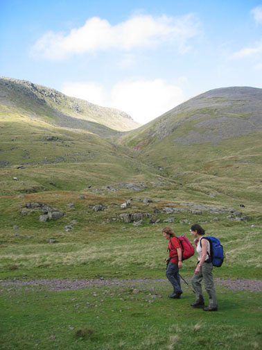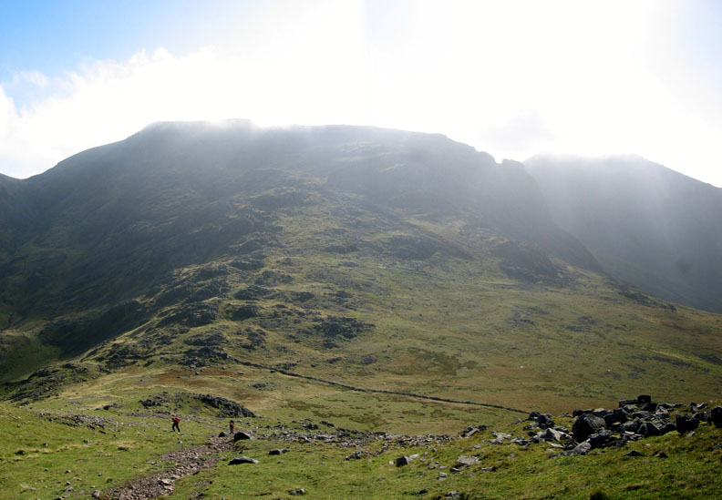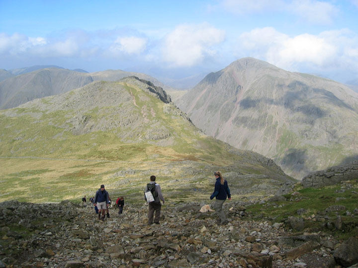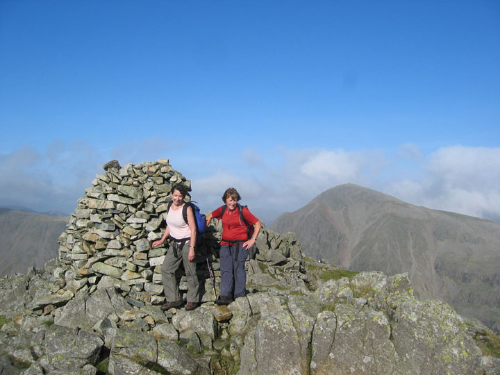 Before we climb Scafell Pike, there is the little matter of Lingmell to visit first. Ann and Jill start the ascent from Lingmell Col. The first summit of the day, about three hours or so into the walk.