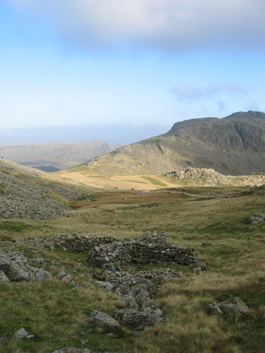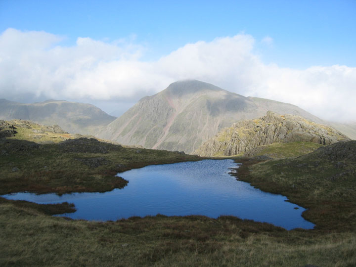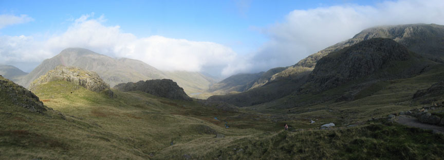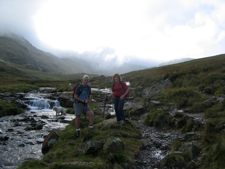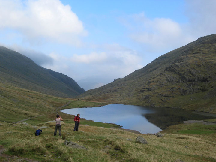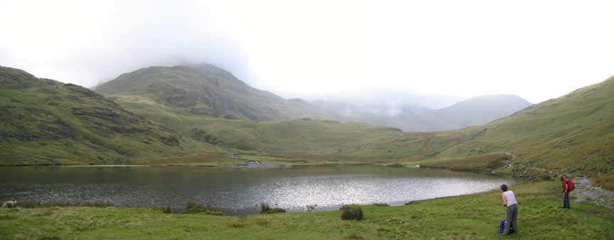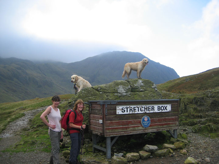 A wide view of Styhead Tarn. Behind is Great End in the mist, the Scafells missing completely, and Lingmell just clear of the cloud. A Patagonia Moment Ann poses as foreground for Jill's photo of the tarn. A well known landmark, the Stretcher Box, sheltering behind the rock at Sty Head.