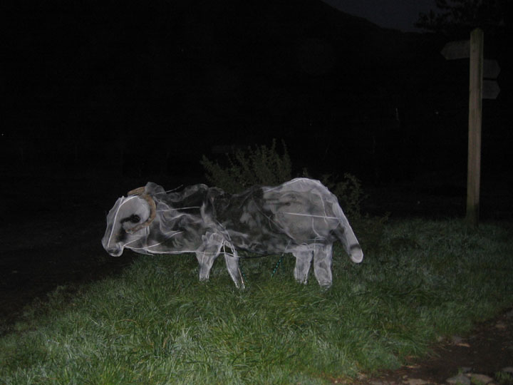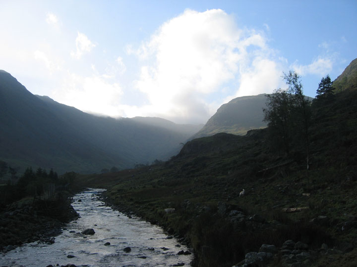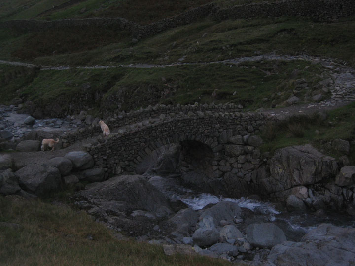 Just the long walk out now as we make our way down towards Ruddy Gill. The familiar outline of the Gables ahead, but they can wait till for a while. Great End Crags behind as we turn down Grains Gill. A darker photo of Stockley Bridge as the sun has set on the valley path. A ghostly artwork of a Herdwick Sheep greets us as we return to Seathwaite Farm at the end a very successful day on the fells.