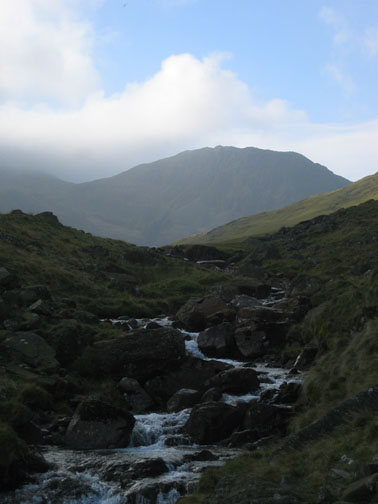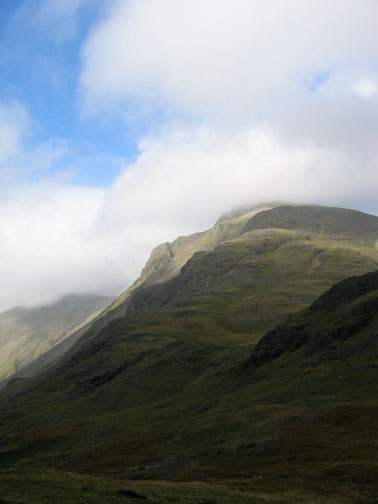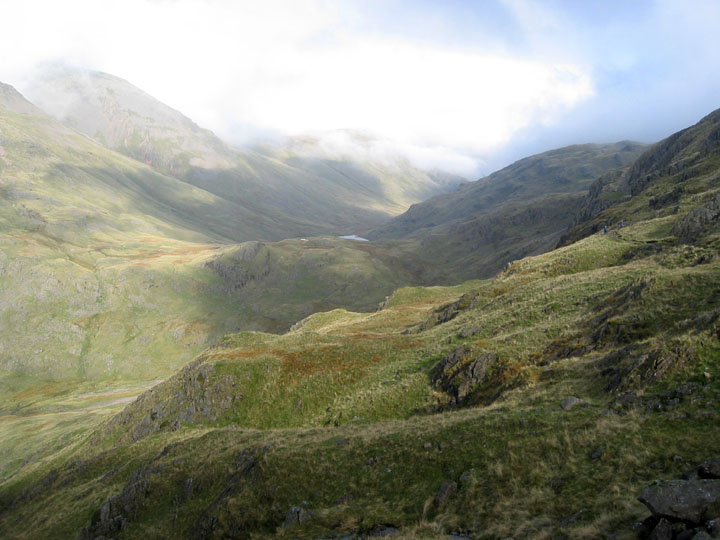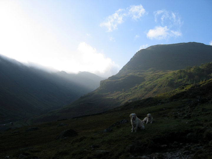 Sun shining through the Glaramara cloud onto Seathwaite Fell. The dogs wait as we catch up and together we soon climb into the sunshine. A great little scramble as we climb up the valley alongside Taylorgill Force Atmospheric high clouds on Scafell as we near Styhead. The weather suggests a continued good day as there seems to be no malice in these high mountain mists.