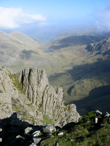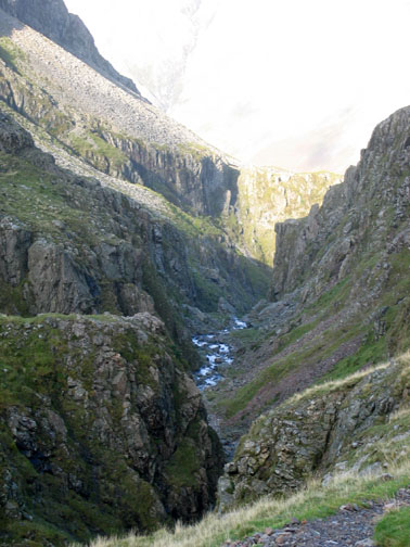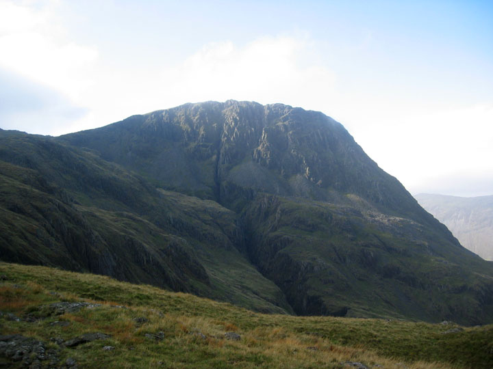 The start of the Corridor Route has two options. Either you can climb slightly towards Esk Hause and drop down onto it as we did, or you can drop down towards Wasdale slightly and climb up to it , as in the second picture. Looking back along our route. Styhead in the distance now, and our path high on the right of the photo. At last, Lingmell is starting to look a little closer. Piers Gill is the dramatic water worn valley following the fault line off Lingmell. Clear summits ~ here the top of Lingmell ~ not far to go now. Looking back again from the end of the Corridor Route this time. That cloud is lifting slowly but progressively. It looks like the weather is on our side today. Great Gable as seen from just before Lingmell Col.