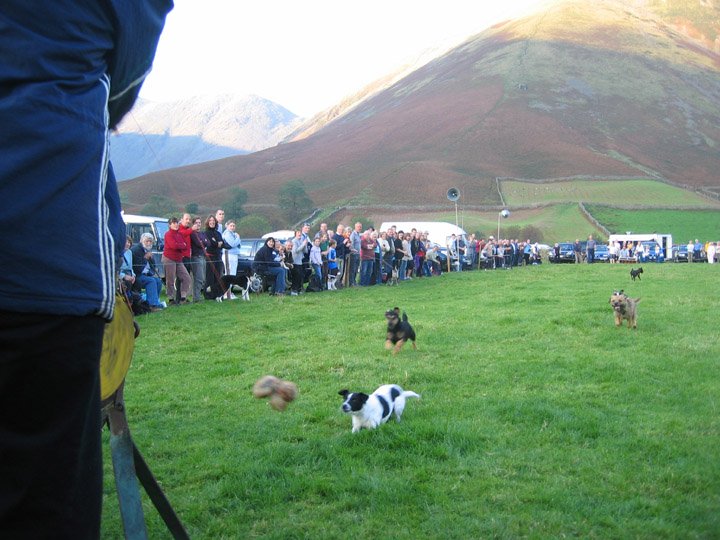 The idea is to topple your opponent without letting go of your grip. He who hits the ground first loses. - - - o o o - - - Afterwards they used the same part of the field for the Terrier Racing . . . . organised chaos, but great fun. They started four up from a wooden starting trap at the far end and raced the length of the field.