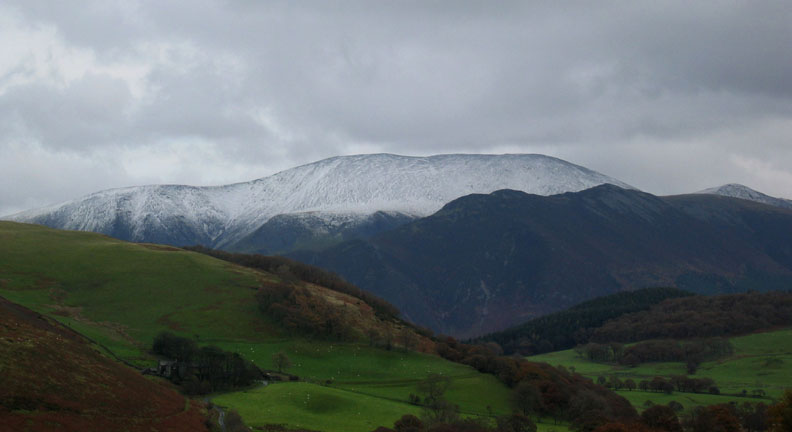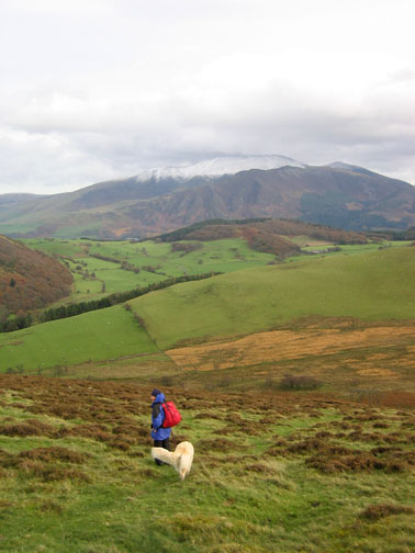 It was a wintery day in Cumbria as we drove down the valley for today's walk. Two nights of wintery showers have left the high fells with a covering of snow. It has been wet down here in the valley and the forecast is for a window of reasonable weather before the next front blows in at the end of the afternoon. Time to get out while it is is still dry. We parked above Eskin Farm, up the valley from Wythop Mill. Sale Fell is the one on the corner, as the A66 reaches the top of Bassenthwaite Lake and turns for Cockermouth, but today we're climbing Ling Fell, it's close neighbour. Over the other side of the unseen Bassenthwaite Lake is the high summit of Skiddaw. Overnight snow gives it a wintery look and makes the ridge of Ullock Pike and Longside Edge stand out clearly. Snow on the tops also means another thing - I didn't win the Fishers staff competition - guess the date of the first snow - not Dec 4th obviously :o( Coincidentally these are called Fisher Woods, fine Autumnal colours, in Wythop Valley. Pity there's no sun to show them at their best. Ann climbs the wide footpath that gradually curves around and up the hillside towards the summit. The old Grouse Butts, now reduced to piles of stones. Harry and Bethan reach the summit trig point. Behind are Grisedale Pike and Hopegill Head, above the dark trees of Widow Hause on the next ridge over.