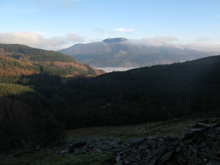 Today was one of those winter days that made up for the last five weeks of damp, miserable Autumnal weather. A fine sunrise struggling through the valley mist, and the prospect of clear fells and sunshine up high, found us packing lunch into the rucksacks and donning our boots for a linear walk on the North Western Fells. Frost on the forest track as we parked the car. We had left the valley gloom behind as we drove up Whinlatter Pass but the temperature was still around freezing here.