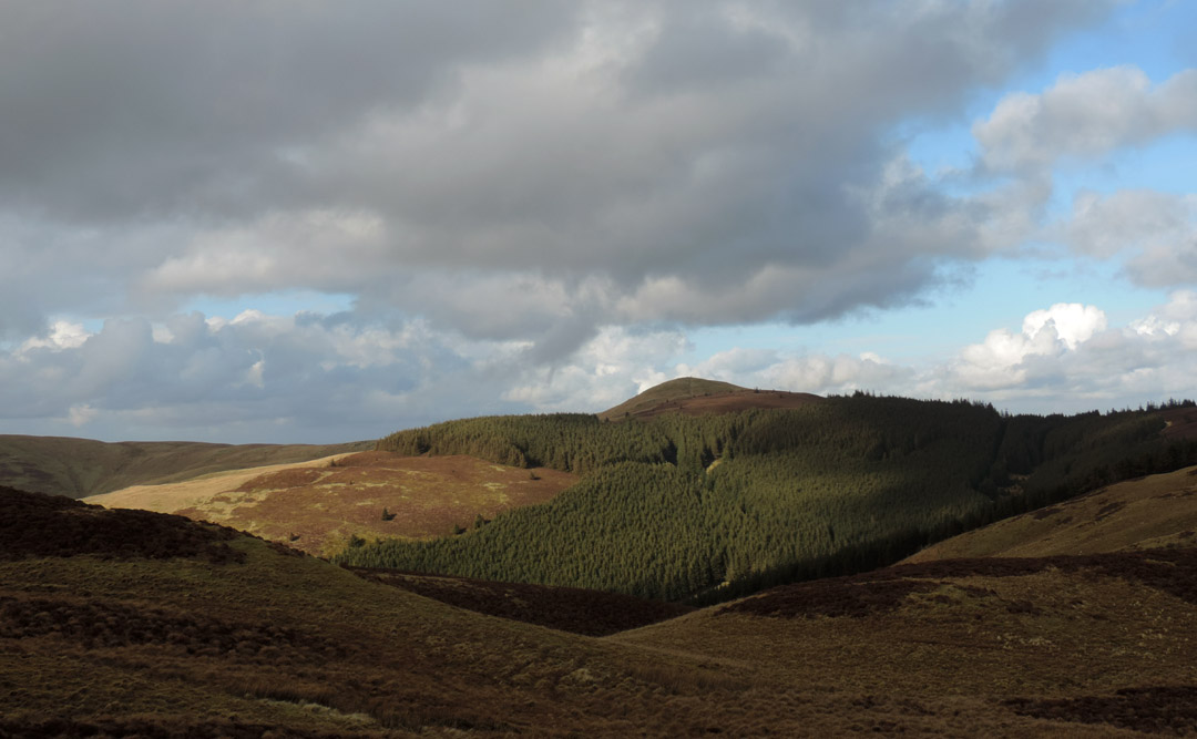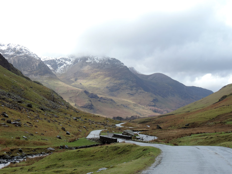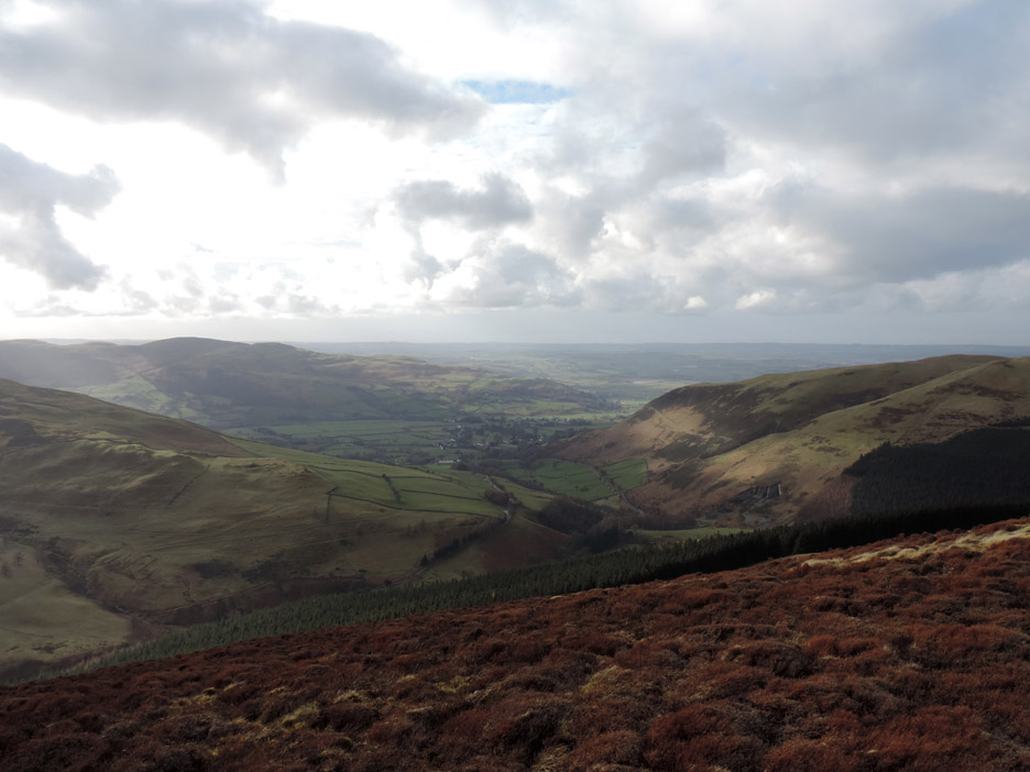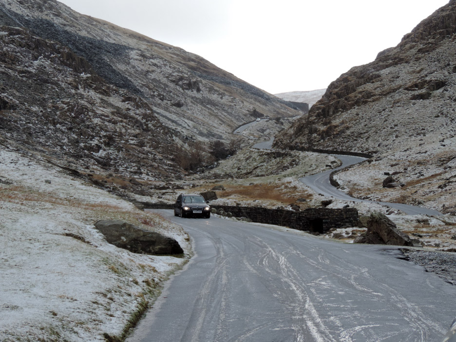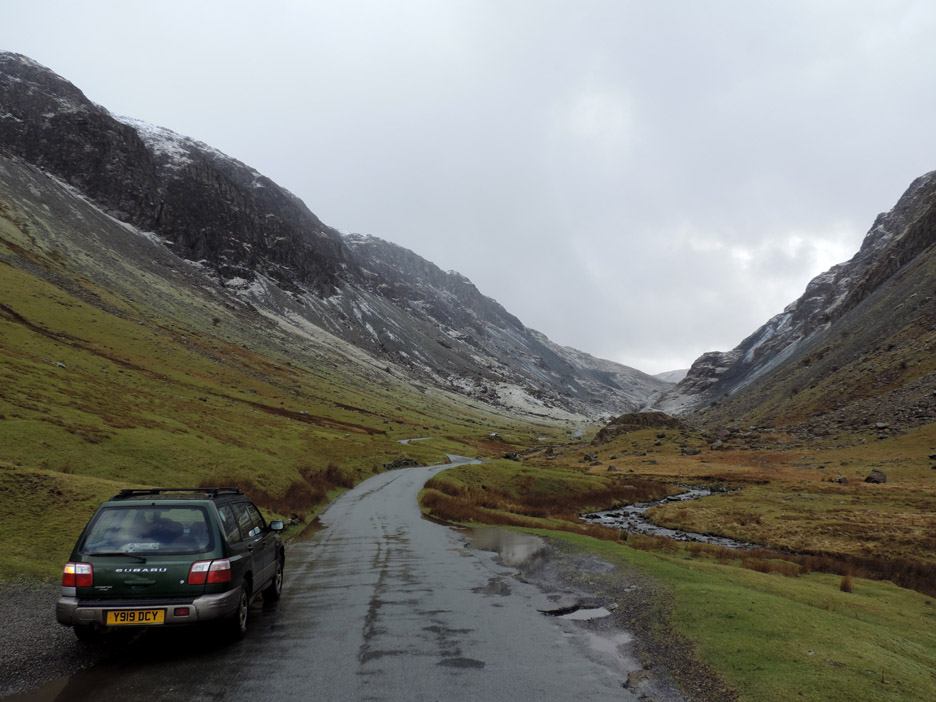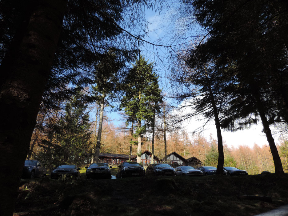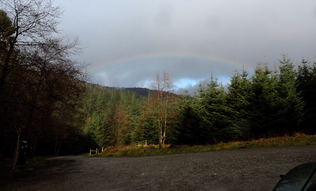 Sunshine at the head of the Buttermere valley was visible from home so in need of a walk to suit all today, we set off to climb Dale Head from Honister Hause, in order to get a big view with a steady ascent. Hope the snow doesn't stop us. Whinlatter via Honister is a strange title for a walk report as the two locations are in totally opposite directions from home, but soon after the start of our journey the vagaries of the weather demanded a change of plan even though we had driven the length of the Buttermere Valley in order to start our walk. Mmm . . . a photo stop on the way up Honister Valley. A picture taken from the same spot as the previous one . . . but with a totally different weather outlook. There is sunshine up there as the wintery shower moves away, so we continued on in hope . . . Honister Pass from below . . . this is as far as we got . . . the road was very slippery and difficult to stand on. The drivers coming down the hill after being caught in the snow were advising against proceeding further ! Time for a quick change of plans . . . and we drive back down the Buttermere Valley and head off to Whinlatter. The main Forest Centre car park was looking full so we parked over at Revelin Moss. [ Both car parks demand a ticket but this side is marginally cheaper.] Sunshine after the rain . . . the rainbow highlights the passing of the wet weather.
