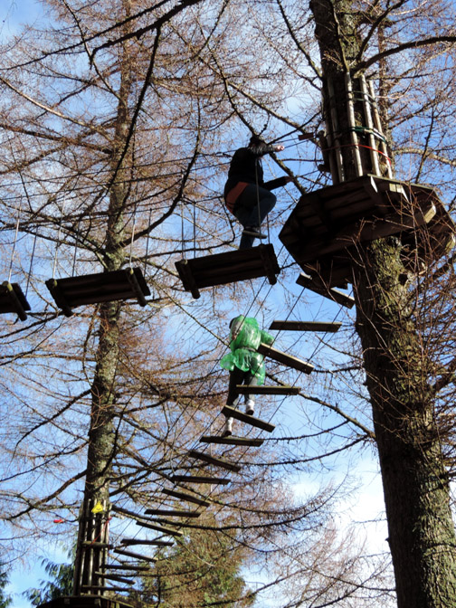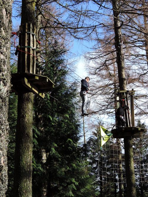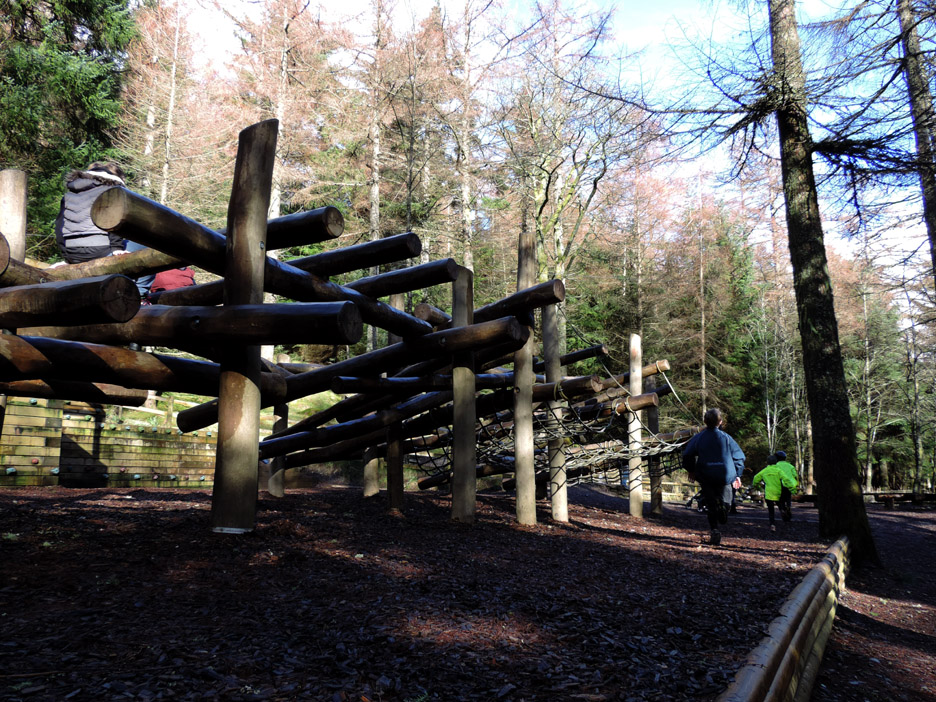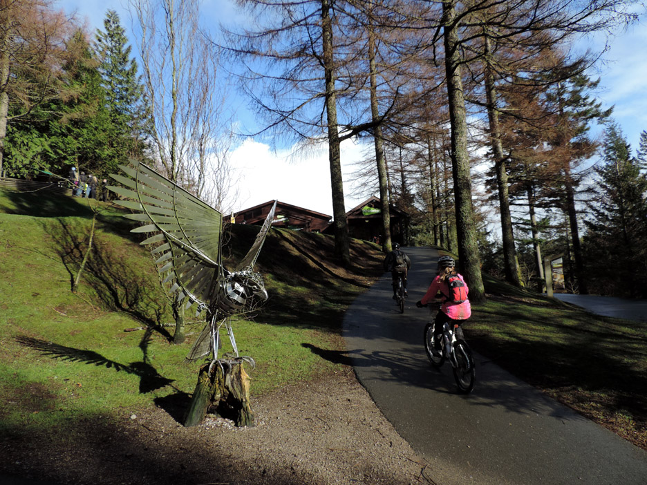 The off-road parking we used last time we climbed Whinlatter no longer exists, hence the parking at Revelin Moss today. Our walk starts by crossing over the main road and walking up past the Forest Centre. The Osprey Sculpture The bird is looking good . . . but the base is looking rather rotten after several years of loyal service. We walk up through the woodland paths, passing through the Go Ape arena on the way.