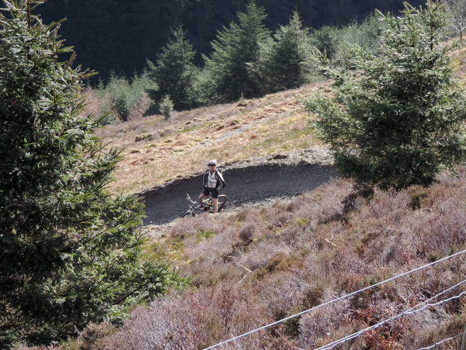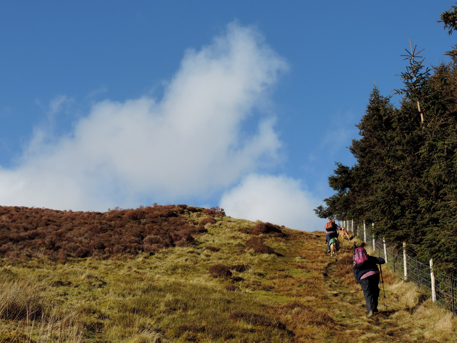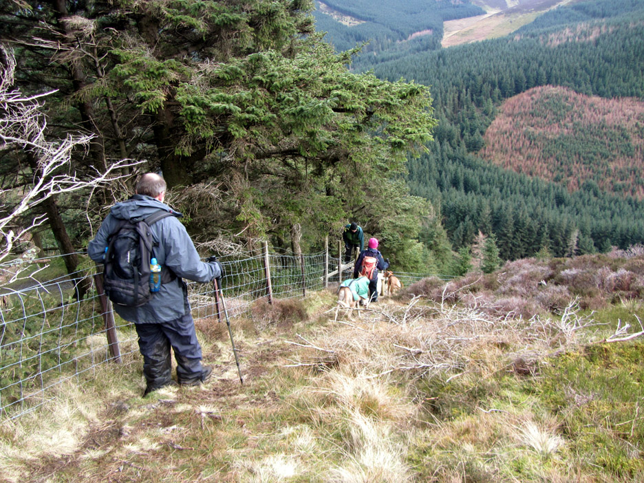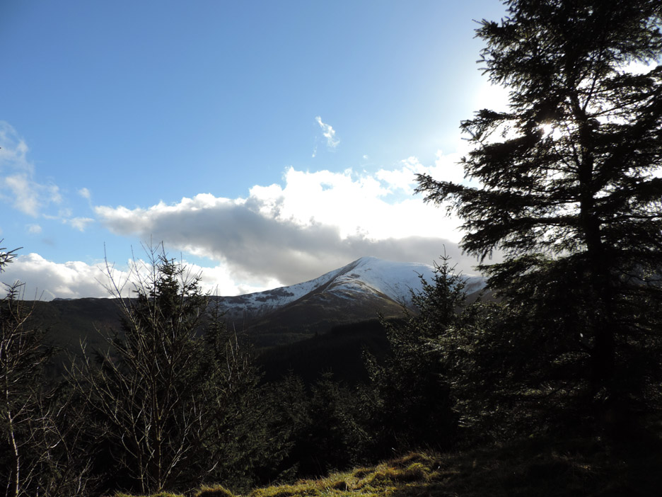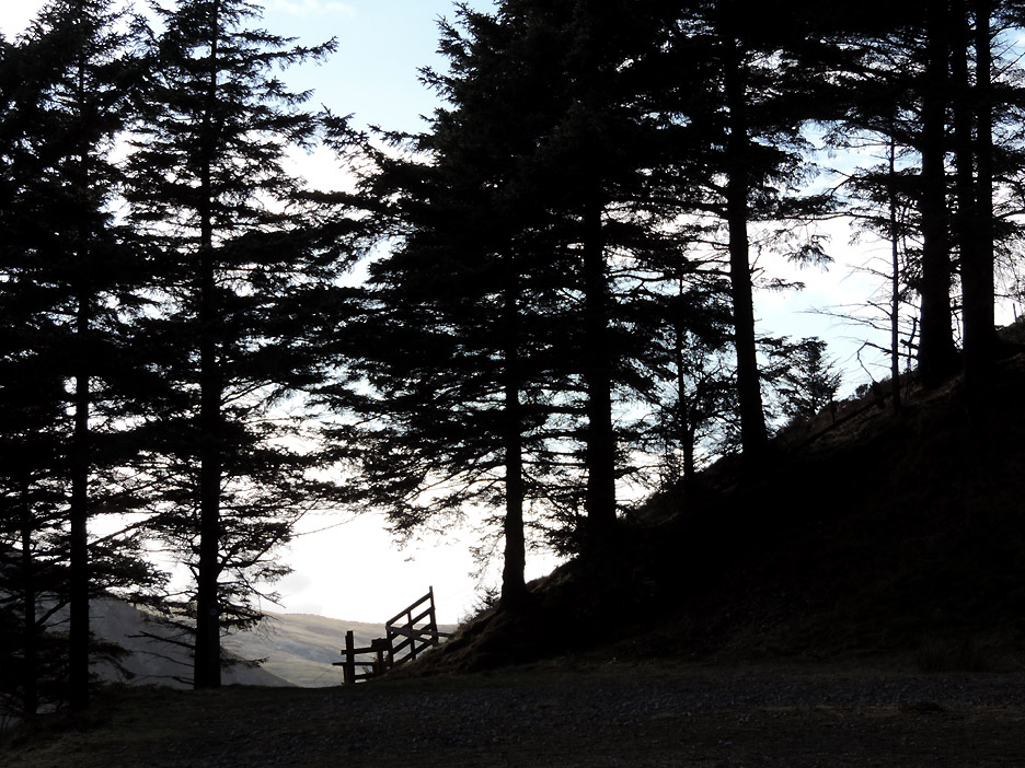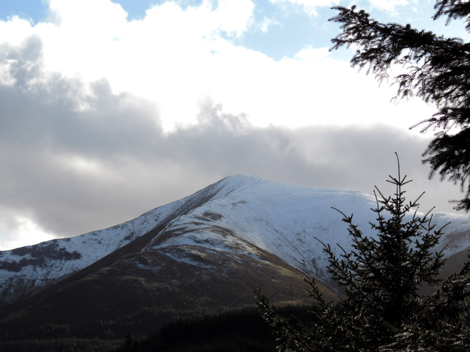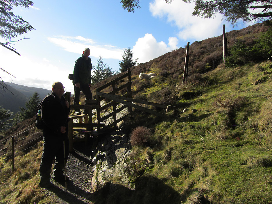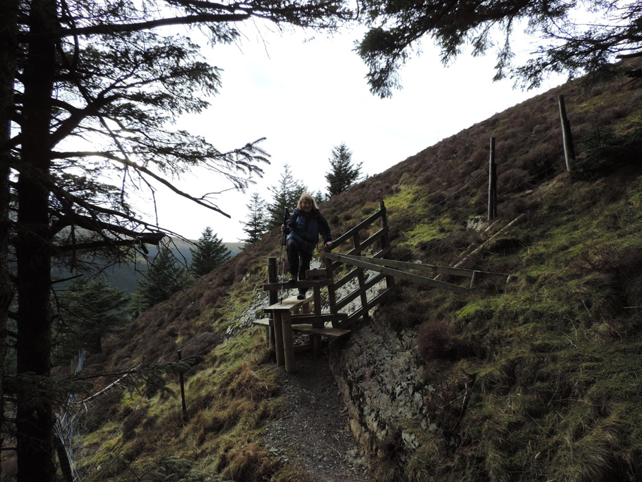Closer to the ground . . . a climbing frame with attitude, part of the forest attractions ! We head up towards the summit path on the forest roads, stopping here to admire the view and read the information board about red squirrels. A fine view of snow-capped Grisedale Pike. Zooming in on the top. The wall from Revelin Moss, which makes navigation from that side easy, can be seen climbing the central spur into the snow. The Hobcarton ridge, with the Magic Tree on it, falls away to the right. As we zig-zag up on the forest tracks the view through the gaps in the trees becomes more extensive. End of the road . . . start of the path. Ian and myself at the stile that leads out onto the fellside.