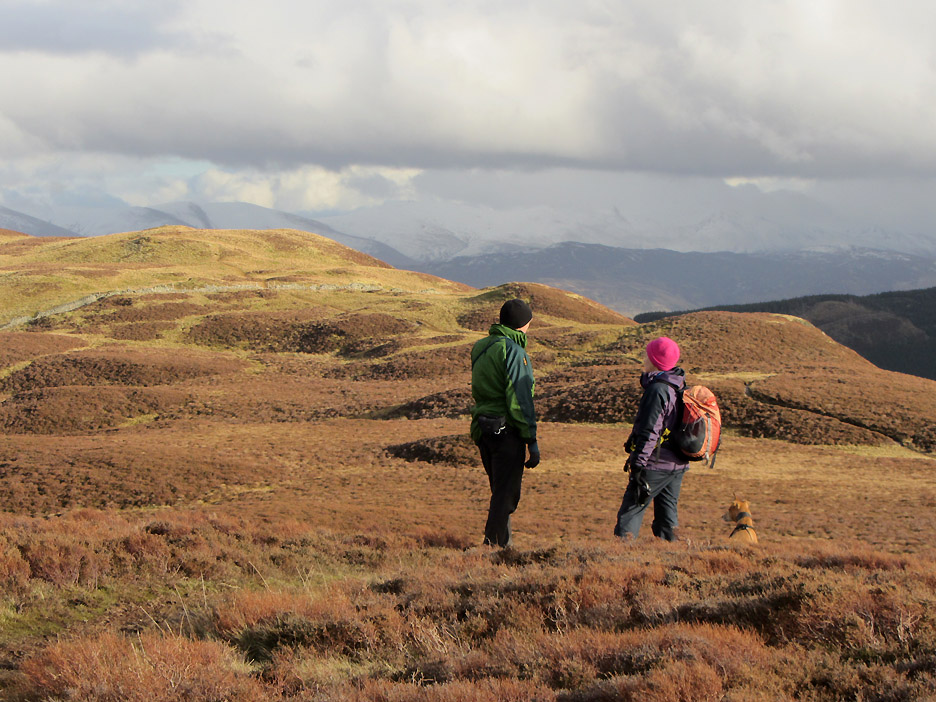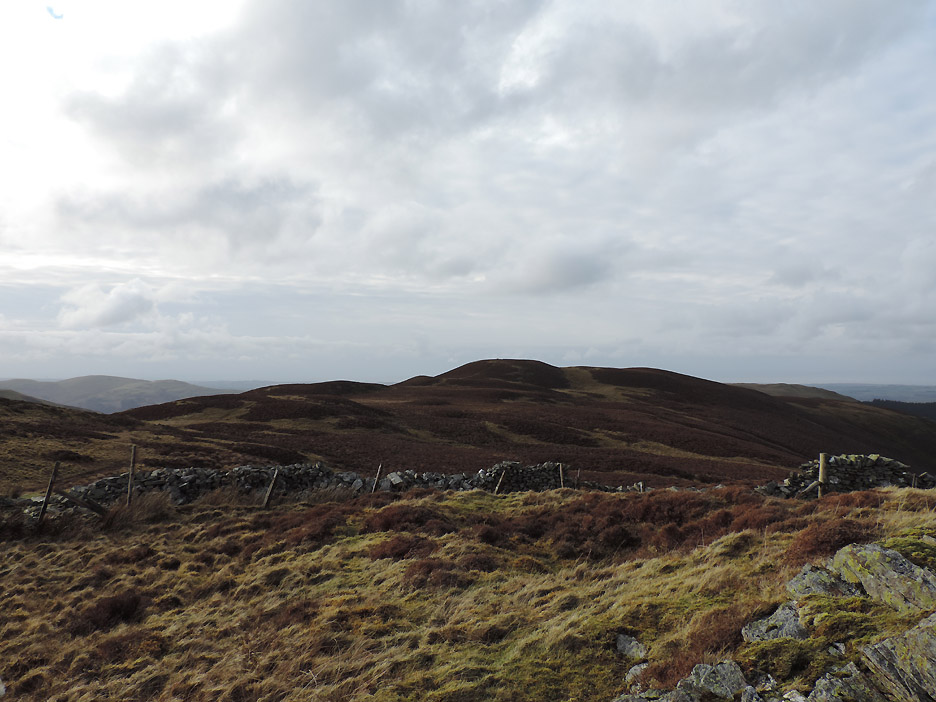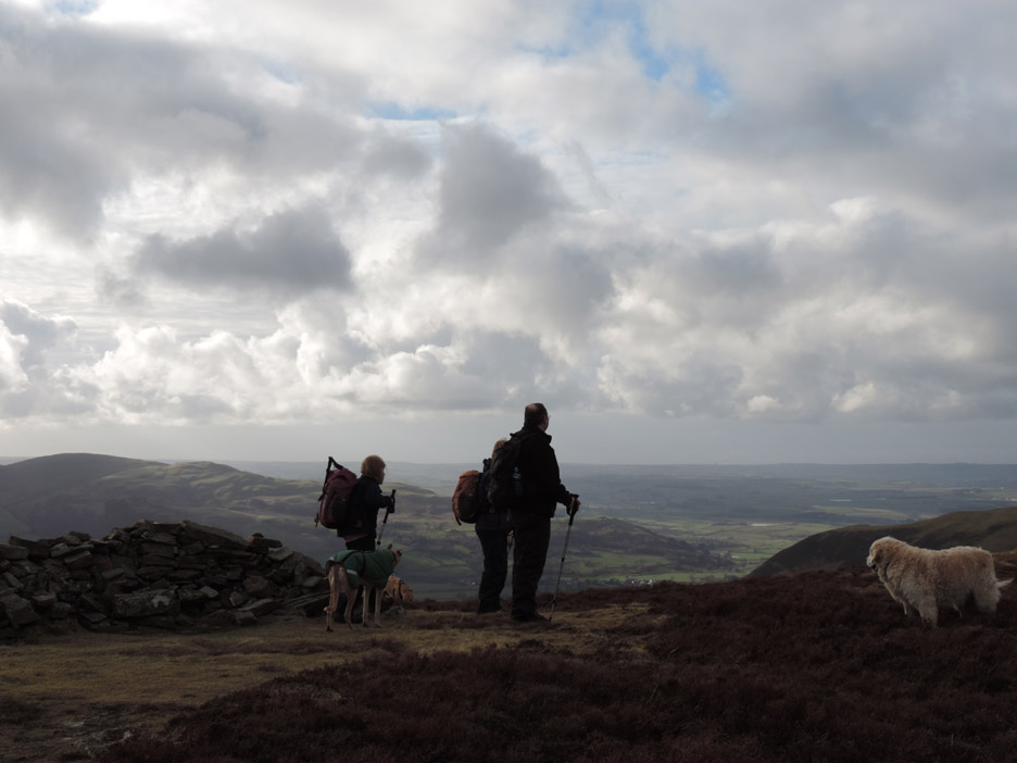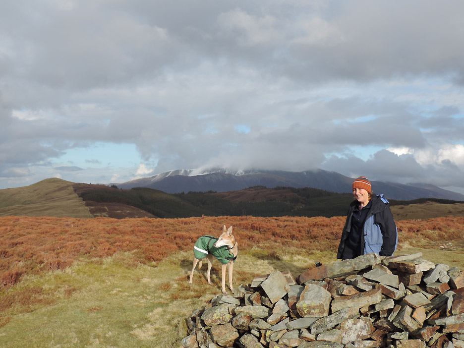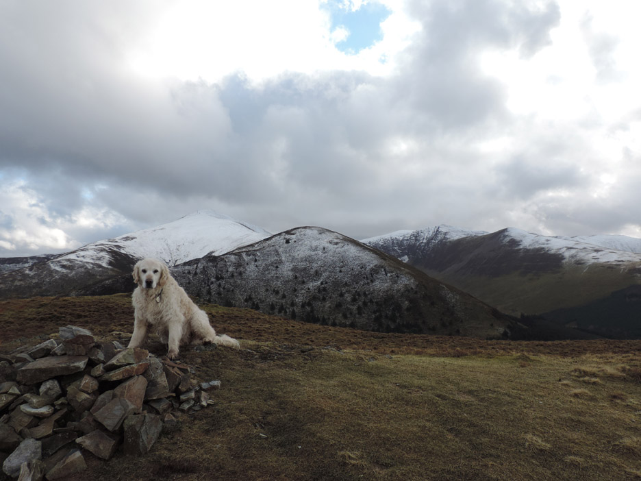 One of the many mountain bike routes that criss-cross the forest. Nowadays Whinlatter is a forest full of outdoor pursuits. Onward and upward . . . this is the steepest part of the climb . . . but it doesn't last too long. Soon you are out on the ridge where the views on a day like today are very extensive. This is Lords Seat taken from near Whinlatter top. Click here or on the photo above for a Loweswatercam 360 degree annotated panorama Close up on Skiddaw. Plenty of snow and just a little cloud . . . no doubt to tease successful summiteers with rather intermittent views. As we make the final climb to the top there's a grey cloud moving across our part of the fells. Grisedale Pike now takes on a black-and-white appearance. It doesn't spoil the enjoyment, but it does make us wrap up slightly more warmly. These three Whinlatter summiteers are Ian, Jo and myself, with our three dogs. The fourth summiteer Ann, is taking the photo of course. A wider summit shot with just Harry. We can now see into the Hobcarton Valley with the twin peaks of Ladyside Pike and Hopegill Head in the distance. To extend the walk we headed on to the outlier summit of Brown How, seen here to the west. From our second summit we looked out over the Solway Plain. Below us is the Aiken Beck Valley, Fellbarrow and the village of Lorton in the distance. As we took in the views, the sun came out and added colour to the fells once again. Time to be heading back . . . the path across had been wet at times but no great problem. Jo and I discuss the view. Another dark shadow was covering the Helvellyn Ridge . . . it looked to be snowing over there. One more boggy bit and we'll be back on high ground. The open-fell section of the walk was drawing to a close as we retraced our steps down the fellside to the stile. A complex wooden structure due to the adjacent slab of rock.