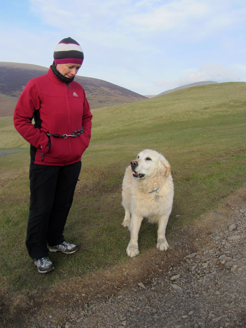 there's a great view from up there today. Hello from my two companions, Dee and John. Lovely views on this sunny afternoon, here looking back towards Skiddaw. Panoramic views over Keswick and Derwent Water today from Latrigg summit ridge. Meet Amber, our wind-ometer for the day. Amber is Harry's half sister, now into her fourteenth year, though still enjoying her shorter walks.