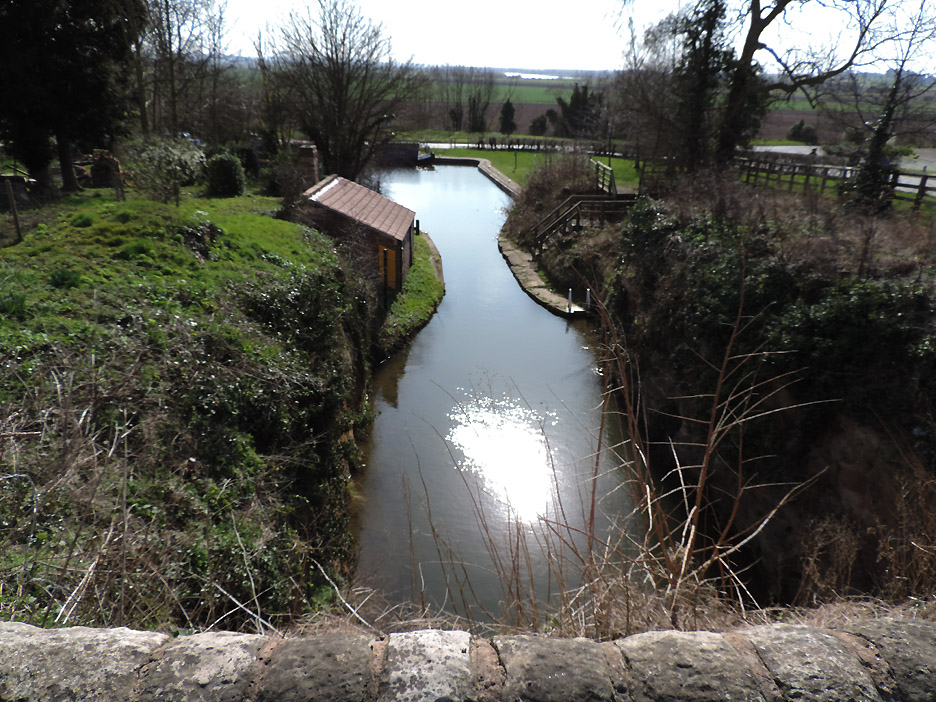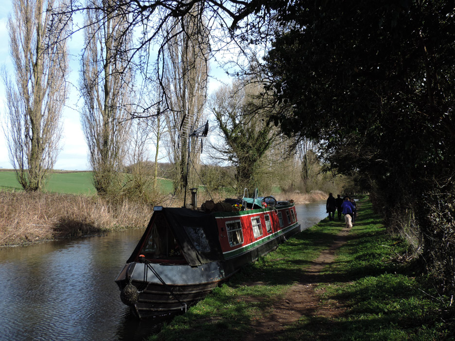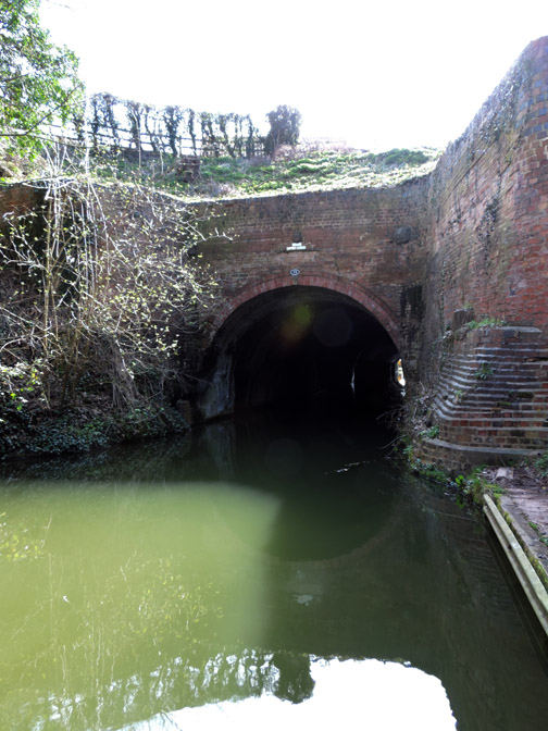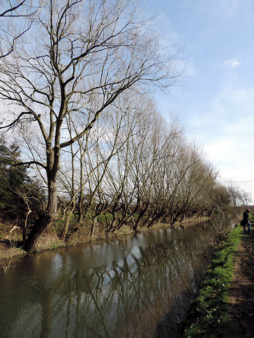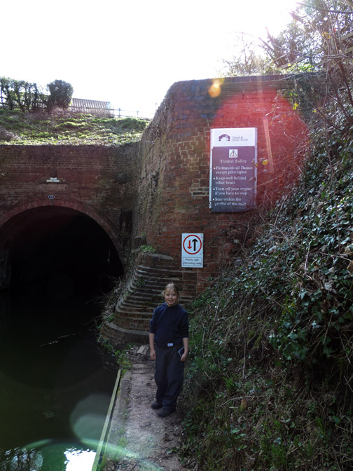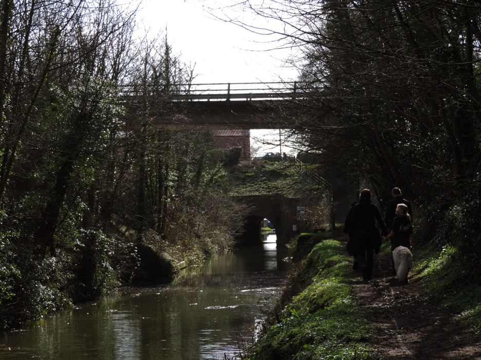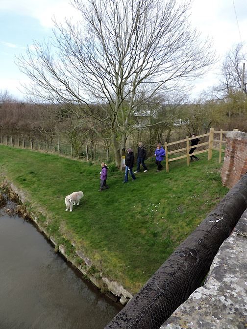 The first bridge of our walk known as Middle Bridge as there are three bridges for three parallel roads on this side of the village. I held back slightly to catch this group photo of the family down on the towpath. Paula, Abi, Tom, Al and Ann. Abi has a new camera and wanted to take her own pictures close to the next bridge. This was the overflow tunnel from the adjacent lock gates. It all goes to prove that, although the canal seems level, there is a constant movement of water along its length. The lock gates and Keepers Cottage. The overflow stream carries the excess water from above the second lock gate to avoid the canal overflowing the lock. This is extensive arable country with flat fields as far as the eye can see. This crop was some sort of beet or kale, it was too early to tell exactly what from the leaves. Gentle walking along the canal tow path . . . . . . in the lovely sunshine. Abi and Ann making use of a fallen tree for a few moments . . . . . . whilst Tom takes a more elevated view of life. An old building on the opposite bank of the canal has seen better days. Canal wildlife, Mr and Mrs Mallard. As we walked along we tried to draw level with them . . . . . . but each time they flew off and landed a little further up the canal till they got bored and flew away completely. The canal has to negotiate Cuckoo Hill. It could be done with a longer diversion to the west but the choice was to build a short tunnel.