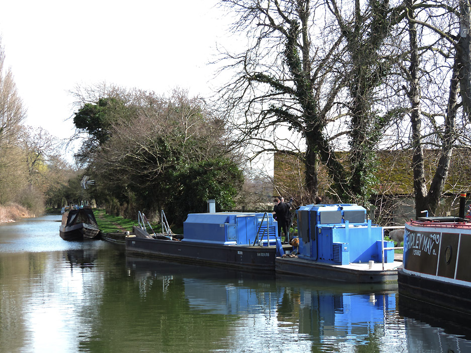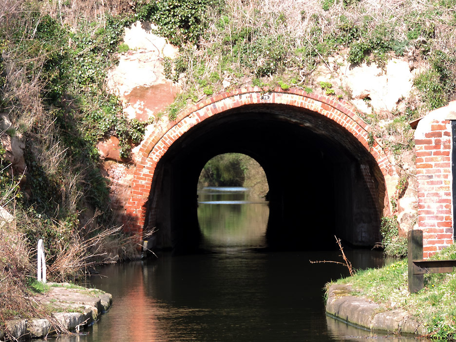 The towpath goes up and over the top. The other end of the tunnel, approximately a hundred yards further on. Looking back through the arch, foreshortened by the zoom. Moored up beyond the turn is a British Waterways maintenance vessel, a blue tug and a work barge. We had passed signs of their labours in the cut tree trunks and pruned hedges along the way. This classic long boat was obviously home to someone by the looks of the logs, wheelbarrow, and bike on the cabin roof.